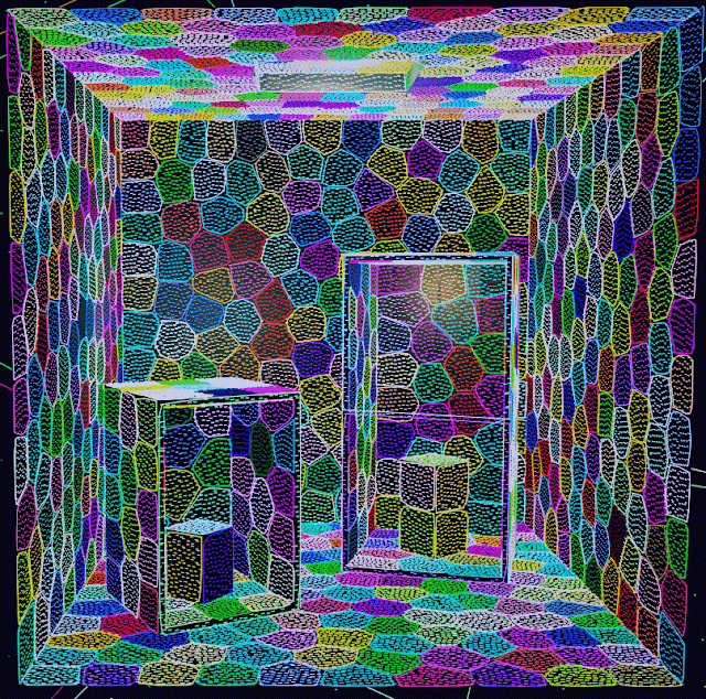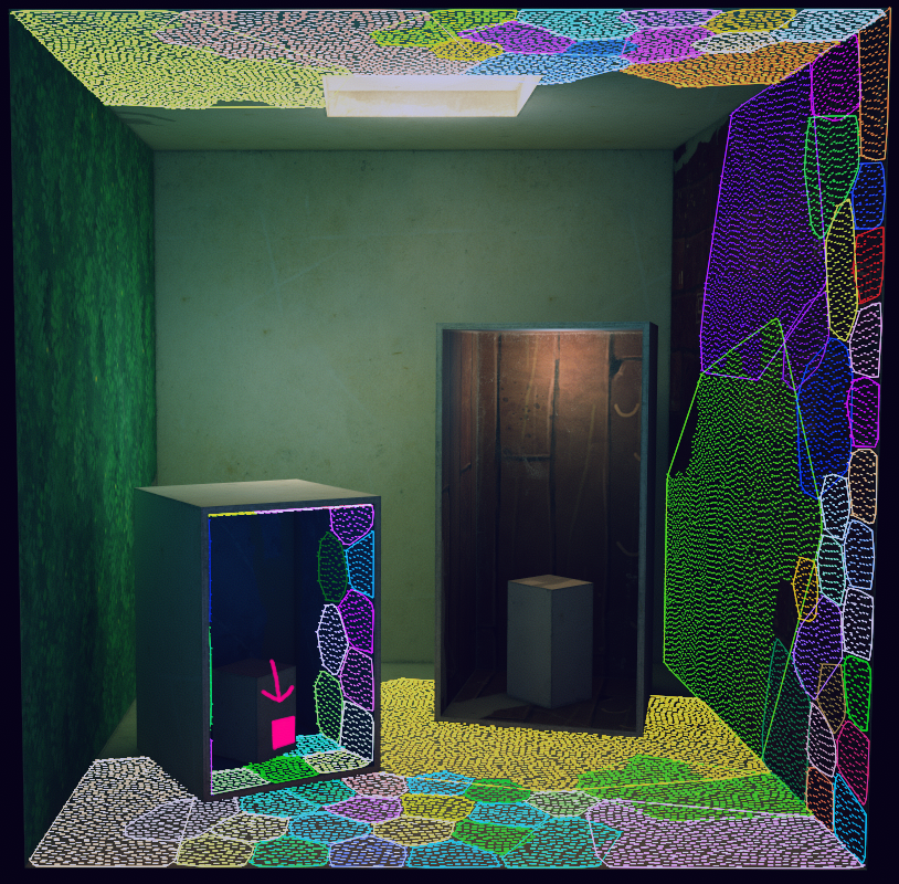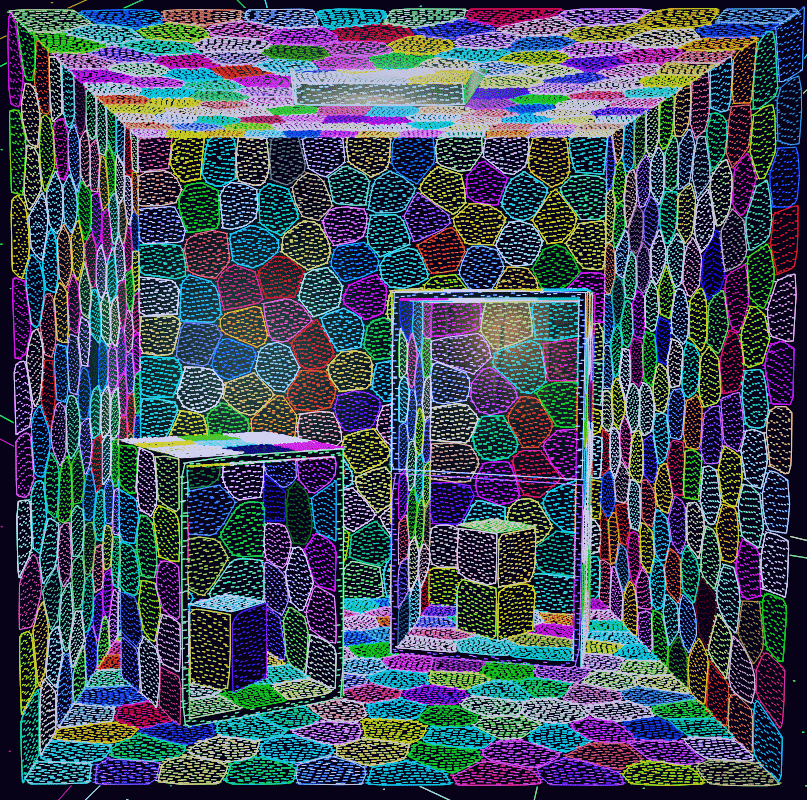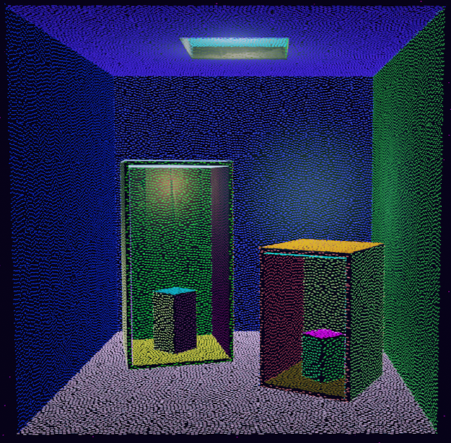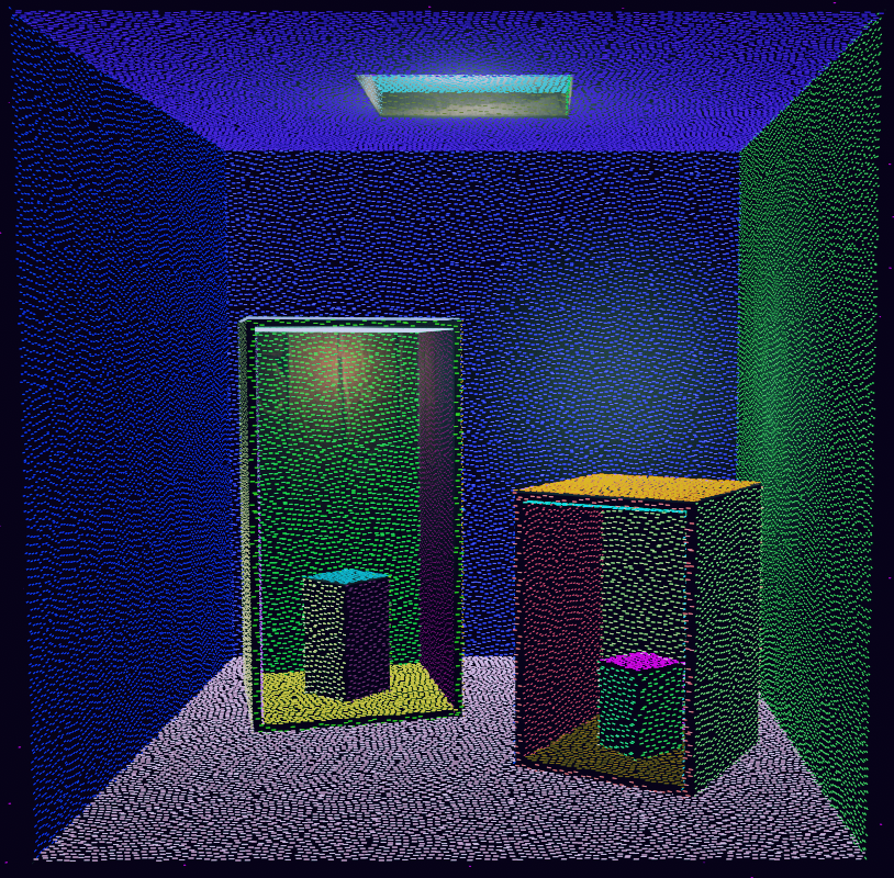 Next up we have to divide the scene into surfels (surface elements) and then cluster those surfels into a hierarchy. At runtime these surfels are lit and the lighting results are propagated up the hierarchy. This lighting information is then used to update the lightmap.Surfel placement plays a big part in the quality of the illumination and I've been through a few iterations. Initially I tried random placement with rejection if a surfel was too close to it's neighbours but this was hellishly slow. I also tried a 3D version of this which was much faster but looking at the results I felt the coverage could be better. Particularly around edges and on thin objects, the neighbour rejection techniques would often leave gaps that I felt could be filled. This seemed like it could be addressed by relaxing the points but I wanted to try something else.